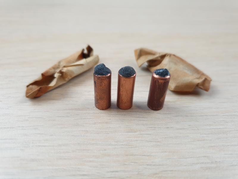 Set of 3 copper tube igniters. With 2 wrappers Made to ignite safety fuse. These items were packed in little tins, and dropped for the resistance movements in occupied Europe.