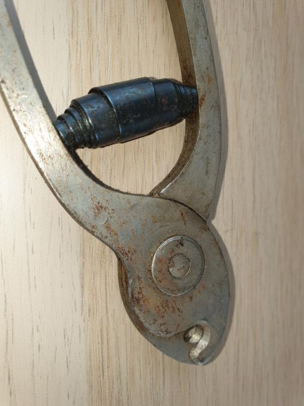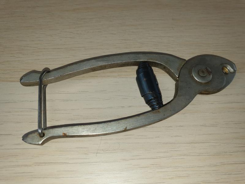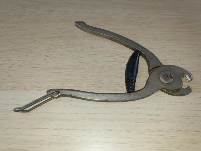 This is er very strong havy duty crimper tool. First, to cut the cordtex and safety fuse, and second to crimp a detonator in place. The tool is made of several layers of steel plate.